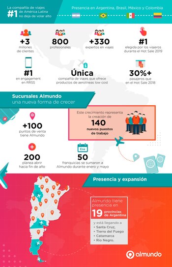 Para continuar creciendo en el plano local, Almundo le ofrece a emprendedores y agencias de viajes que quieran reconvertirse, un modelo de franquicias rentable que incluye el acceso a todos los diferenciales que ofrece la compañía en materia de tecnología, asesoramiento con un esquema de capacitaciones mensuales para brindar la mejor experiencia, productos, tarifas, financiación, inversión publicitaria y generación omnicanal de nuevos clientes.