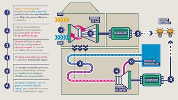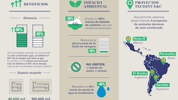 Mientras que en las centrales convencionales, a carbón, solo se obtiene el 45% de la energía interna del combustible utilizado, en una central de ciclo combinado, a gas, se obtiene el 60% de la energía que tiene el gas.