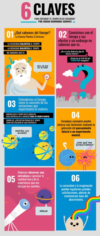 A través de sus páginas, el libro introduce al concepto del tiempo, narra una breve historia del mismo y plantea un experimento mental para comprenderlo mejor. “Se trata de un ensayo teórico-práctico que comienza con un breve repaso por la historia del tiempo y cómo lo hemos ido asimilando los seres humanos. Continúa con una sencilla y sintetizada exposición de las teorías científicas que actualmente arrojan luz sobre este escurridizo concepto. Y finaliza con un curioso y original experimento mental basado en un ejercicio de pensamiento lateral que pretende agitar nuestra imaginación y guiarnos para intuir mejor algunas consecuencias de la dilatación del tiempo que no nos resultan intuitivas. Todo ello se ha intentado comprimir en una lectura de no más de 60 minutos”, sintetizó Hernandez Genovés.