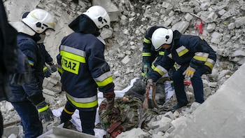 ウクライナ南部のミコラーイウ地方行政ビルへのロシアの攻撃を受けて、火曜日に2つの死体が瓦礫から取り除かれた, AFPジャーナリストが発見.
