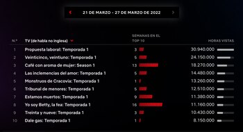 The Squid Game(Squid Game)の成功以来、韓国のプロダクションはNetflixで最も視聴されているランキングで上昇を続けています。最後のトップ10の国際シリーズでは、主要なシリーズでした:仕事の提案(第1回、約3100万時間の視聴回数)、25、二十一(2、2400万人以上)、愛の怒り(4、1400万人以上)、少年裁判所(6、1200万人以上)、私たちは死んでおり(7、1100万人以上)、39(9、1000万人以上)です。