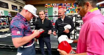 ルイス・ガルシア・ポスティゴとホルヘ・カンポスは、カリフォルニア州サンディエゴにあるエディ・レイノソのジムに到着し、カネロと一緒に一日を過ごしました。スーパーメディアンのトップチャンピオンがいつものセッションをリングの上で開催している間、ドクターガルシアとイモータルと一緒にいるボックスアステカチームは、タパティオと話をするためにスポーツ会場に到着しました。