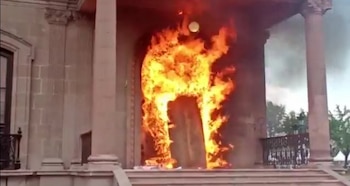 이 대결 후 시위대는 건물 문에 불을 질렀습니다.