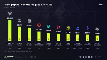 En los puestos siguientes fueron ocupados por el Valorant Champions Tour (VCT) en sexto lugar, destacado por su veloz crecimiento y desarrollo; la ESL Pro League en séptimo lugar como el circuito de CS:GO más consolidado, seguido por BLAST Premier que obtuvo el octavo lugar. El circuito de LoL de Norteamérica, la LCS, obtuvo el noveno lugar y el Rocket League Championship Series (RLCS) se quedó con el décimo lugar, con una audiencia sostenida que alcanzó sus mayores cifras durante la décima temporada.