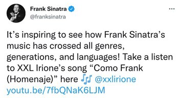 Frank Sinatra es considerado uno de los artistas más reconocidos e importantes del mundo en el siglo XX, su obra trascendió a lo largo de varias generaciones. XXL Irione, es un rapero de Buenos Aires, Argentina. A sus 35 años de edad, se convirtió en el primer rapero a nivel mundial en homenajear en una canción a Frank Sinatra en el día de su cumpleaños, 12 de diciembre.