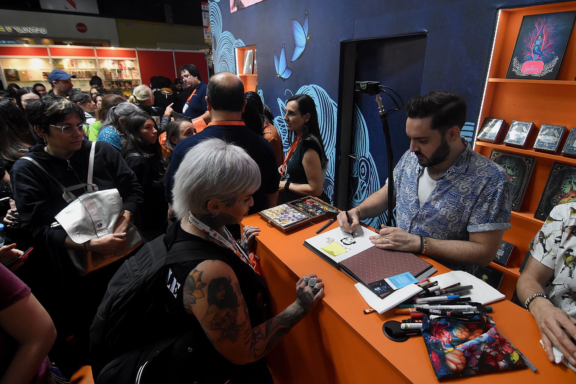 El día anterior a nuestro encuentro, el dúo dinámico Lacombe-Perez convocó a más de 400 personas que durante varias horas formaron copiosa fila que comenzaba en el stand de Edelvives de la Feria del Libro de Buenos Aires y daba vueltas por varios pasillos. Todos en filita para obtener dedicatoria ilustrada de Benjamin, algún intercambio verbal y/o selfie. También en el Malba, luego de la conferencia “El enigma del origen: La sirenita de Hans Christian Andersen”, escritor e ilustrador recibieron a lectoras y lectores, firmaron ejemplares, ilustraron páginas de guarda, se brindaron generosamente.