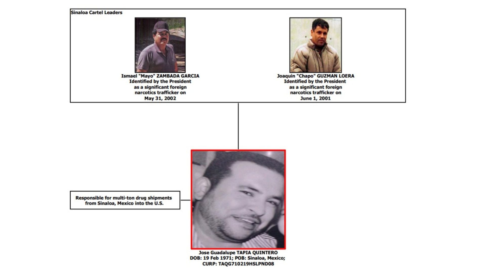De acuerdo con el reporte oficial, “Lupe Tapia” era responsable del tráfico de estupefacientes para Guzmán Loera “desde Sinaloa a Tijuana, Baja California a través de camiones con remolque”.