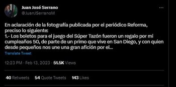 “Los boletos para el juego del Súper Tazón fueron un regalo por mi cumpleaños 50, de parte de un primo que vive en San Diego, y con quien desde pequeños nos une una gran afición por el futbol americano”, señaló en un mensaje en su cuenta de Twitter.