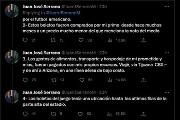 Además, Serreno atajó las críticas sobre su viaje al súper domingo de la NFL hasta la propia sede del encuentro, pues los boletos fueron de los más baratos, considerando que la entrada de menor precio rondaba los 4 mil 100 dólares, es decir, por ambas entradas de regalo, el primo de Serrano desembolsó alrededor de 160 mil pesos.