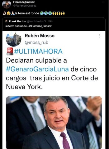Cassez compartió en su cuenta de Twitter el contundente mensaje junto a una fotografía de García Luna con el semblante encajado donde se anuncia que la Corte de Nueva York lo encontró responsable de cinco cargos relacionados al narcotráfico y sus vínculos con el Cártel de Sinaloa.