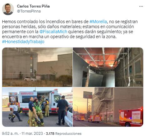 Torres Piña concluyó explicando que los tres incendios terminaron de ser sofocados alrededor de las 9:00 horas: “Estamos en comunicación permanente con la Fiscalía General del Estado de Michoacán quienes darán seguimiento a lo ocurrido; aunado a ello, ya se encuentra en marcha un operativo de seguridad en la zona”, compartió en redes sociales. Además, usuarios de la red compartieron imágenes de las llamas y columnas de humo, mismas que fueron visibles a kilómetros de distancia.