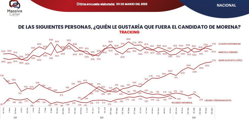 Esto debido a que la encuestadora Massive Caller indicó que el secretario de Gobernación había mostrado un repunto en los números. De acuerdo con los últimos resultados compartidos el pasado 30 de marzo, Adán tuvo mejor percepción en comparación del resto de los aspirantes, ya que se colocó en la primera posición de aceptación con un 68.3%.