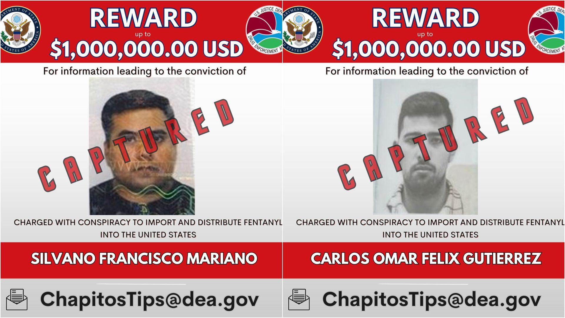 Además, la DEA colocó en la lista a los mexicanos Carlos Omar Félix Gutiérrez y a Silvano Francisco-Mariano, alias Rayo, los cuales son señalados de ser los responsables de los laboratorios clandestinos de Los Chapitos para procesar el fentanilo con los precursores quimicos que son traidos desde China.