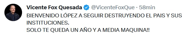 “Bienvenido López a seguir destruyendo el país y sus instituciones. Solo te queda un año y medio y a media máquina”, se pudo leer en la cuenta @VicenteFoxQue.