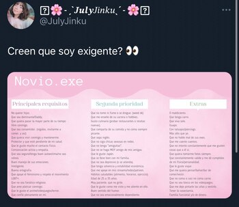 Titulado ‘Novio.exe’, la joven de 22 años de edad dividió sus peticiones en tres secciones: principales requisitos, segunda prioridad y los extras. En la primera sección destaca que su próximo novio no “tener hijos, que quiera vivir con ella, que la mantenga económicamente, le dé regalos, que le guste el anime como a ella, que no sea un fan religioso, que apoye el feminismo y el movimiento y sobre todo que no sea celoso.