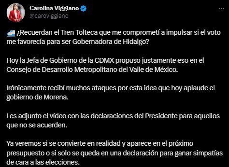 “¿Recuerdan el Tren Tolteca que me comprometí a impulsar si el voto me favorecía para ser gobernadora de Hidalgo? Hoy la jefa de Gobierno de la CDMX propuso justamente eso en el Consejo de Desarrollo Metropolitano del Valle de México. Irónicamente recibí muchos ataques por esta idea que hoy aplaude el gobierno de Morena”, se pudo leer.