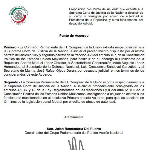 El punto de acuerdo de los panistas, que presentó Julen Rementería Del Puerto, se pidió a la Suprema Corte de Justicia de la Nación (SCJN) que destituya a López Obrador y a otros funcionarios de primer nivel por desacato judicial y sean enjuiciados por abuso de autoridad.