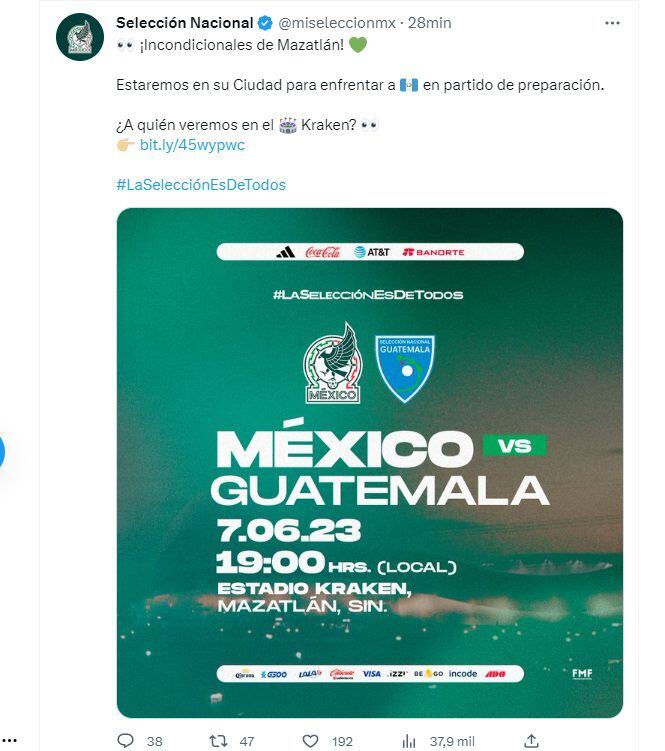 “La Federación Mexicana de Fútbol (FMF) informa que la Selección Nacional de México enfrentará a su similar de Guatemala, el miércoles 7 de junio, en el Estadio Kraken de Mazatlán, Sinaloa, a las 19:00 horas locales, 20:00 hrs. del Centro de México. Esta será la primera ocasión en la que la Selección Nacional de México se presente ante el público del puerto de Mazatlán, en Sinaloa”, redactó el comunicado.