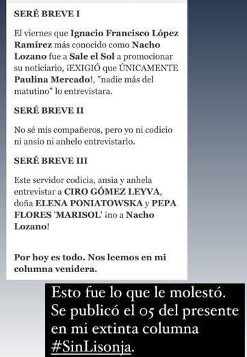 “Me da mucha pena no haber estado ahí, porque tamporo vine a De primera mano entonces no estuve en ninguno de los dos. Nacho Lozano es mi amigo y lo he seguido desde que entró a Imagen, me gusta el estilo de Nacho Lozano. Me enteré por la columna de Álex Kaffie que había pedido que Paulina Mercado lo entrevistara y que Kaffie puso que venía muy mam...n, muy subido y yo dije ‘bueno, es la opinión de Kaffie, no tengo por qué meterme en la opinión de los demás’”.
