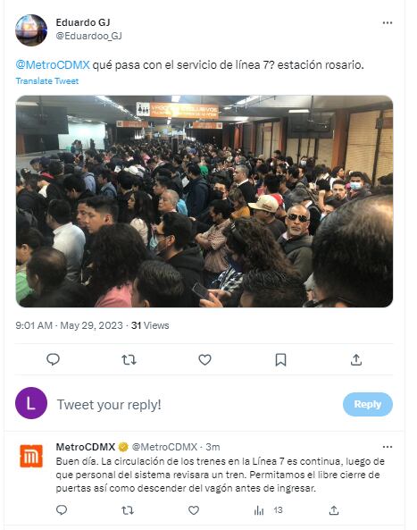 “En Línea 3 dirección Universidad, entre las estaciones Coyoacán y Zapata, está teniendo una vibración muy fuerte”, a lo que la cuenta oficial del Metro respondió: “Se verifica la información con el área correspondiente para su atención”