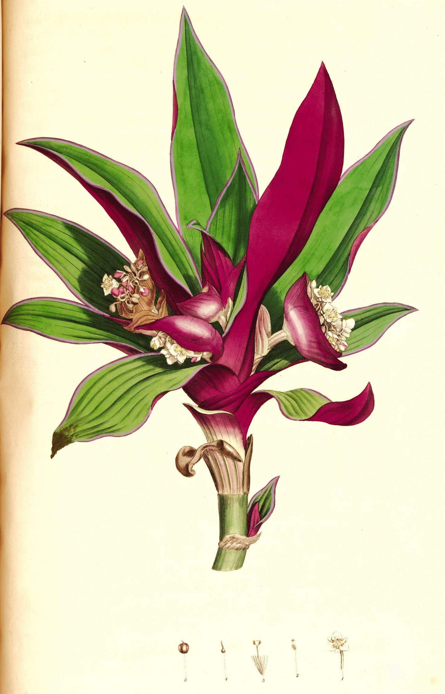 Sus flores pueden llegar a ser de color blanco, de tamaño pequeño y suelen estar protegidas por brácteas del mismo color que el reverso de sus hojas alargadas.