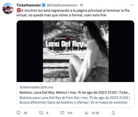 De nueva cuenta Ticketmaster se convierte en objeto de críticas por las repetidas fallas en su sistema para comprar boletos, mismo que el martes 30 de mayo se enfrentó a una gran demanda. Y es que en un mismo día se llevó a cabo la preventa de boletos para el esperado concierto de Lana del Rey en el Foro Sol, así como la preventa de la primera edición del Festival Arre HSBC que reunirá a los mejores exponentes de la música regional mexicana.