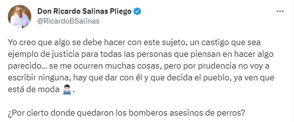 Ricardo Salinas Pliego, quien es uno de los empresarios con más dinero de todo México, fue de las primeras figuras públicas que se hizo presente con su indignación y previo a que dieran con la captura del presunto culpable, consultó a sus seguidores sobre si alguno tenía información del acusado.
