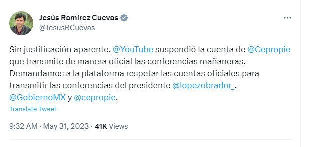 A través de su cuenta de Twitter, el también Coordinador General de Comunicación Social señaló que la suspensión se realizó sin justificación aparente. Y aunque ante medios de comunicación detalló que en el reporte se indica una supuesta violación a las normas internas de YouTube, Ramírez Cuevas señaló que la acción formaría parte de una estrategia de censura.