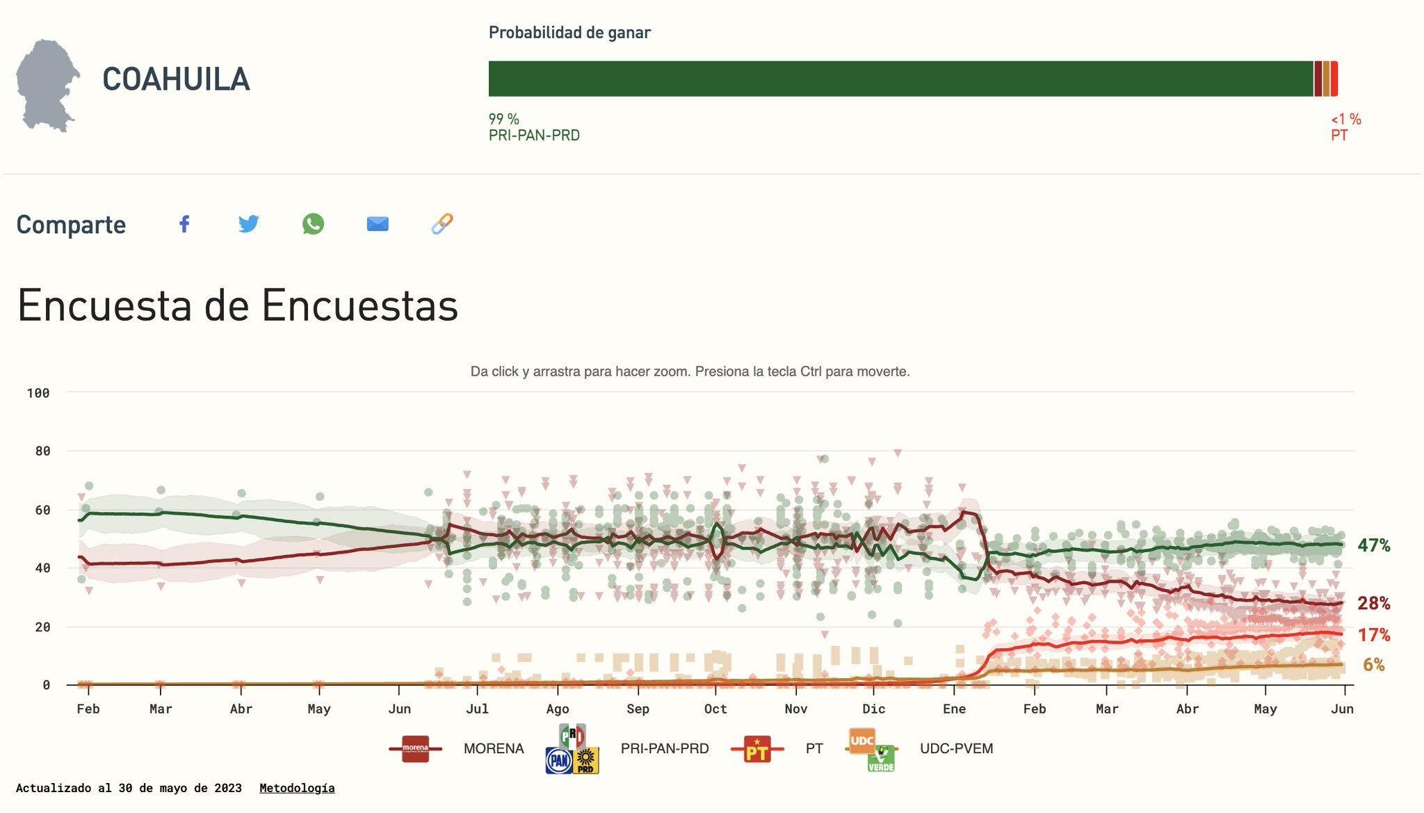 Según la Encuesta de Encuestas de Polls.mx, en las contiendas por las gubernaturas en juego durante 2023, Movimiento Regeneración Nacional (Morena)-Partido del Trabajo (PT)-Partido Verde Ecologista de México (PVEM) tiene una ventaja de 15 puntos frente a Partido Revolucionario Institucional (PRI)-Partido Acción Nacional (PAN)-Partido de la Revolución Democrática-Partido Nueva Alianza (Panal) en el Estado de México. Sin embargo, en la contienda por la gubernatura de Coahuila, la coalición PRI-PAN-PRD tiene una ventaja de 19 puntos sobre Morena, mientras que el PT está a 11 puntos de Morena.