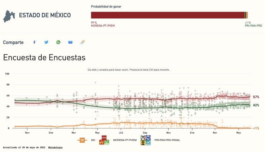 Según la encuesta de Polls, en el Estado de México, Delfina Gómez, la candidata de Morena y sus partidos aliados, tienen una intención de voto ciudadano del 57 por ciento, mientras Alejandra del Moral, la candidata del PRI y sus aliados, cuentan con el 42 por ciento de los votos.