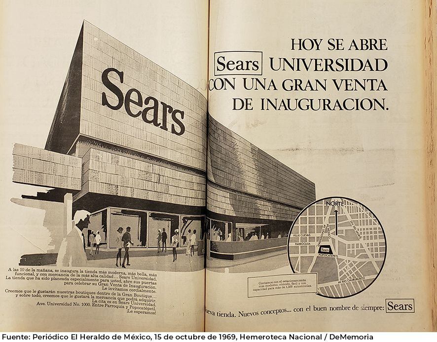 Ilustraciones en periódicos de la época dan cuenta también de la apariencia de Plaza Universidad, incluida la fachada de Sears.