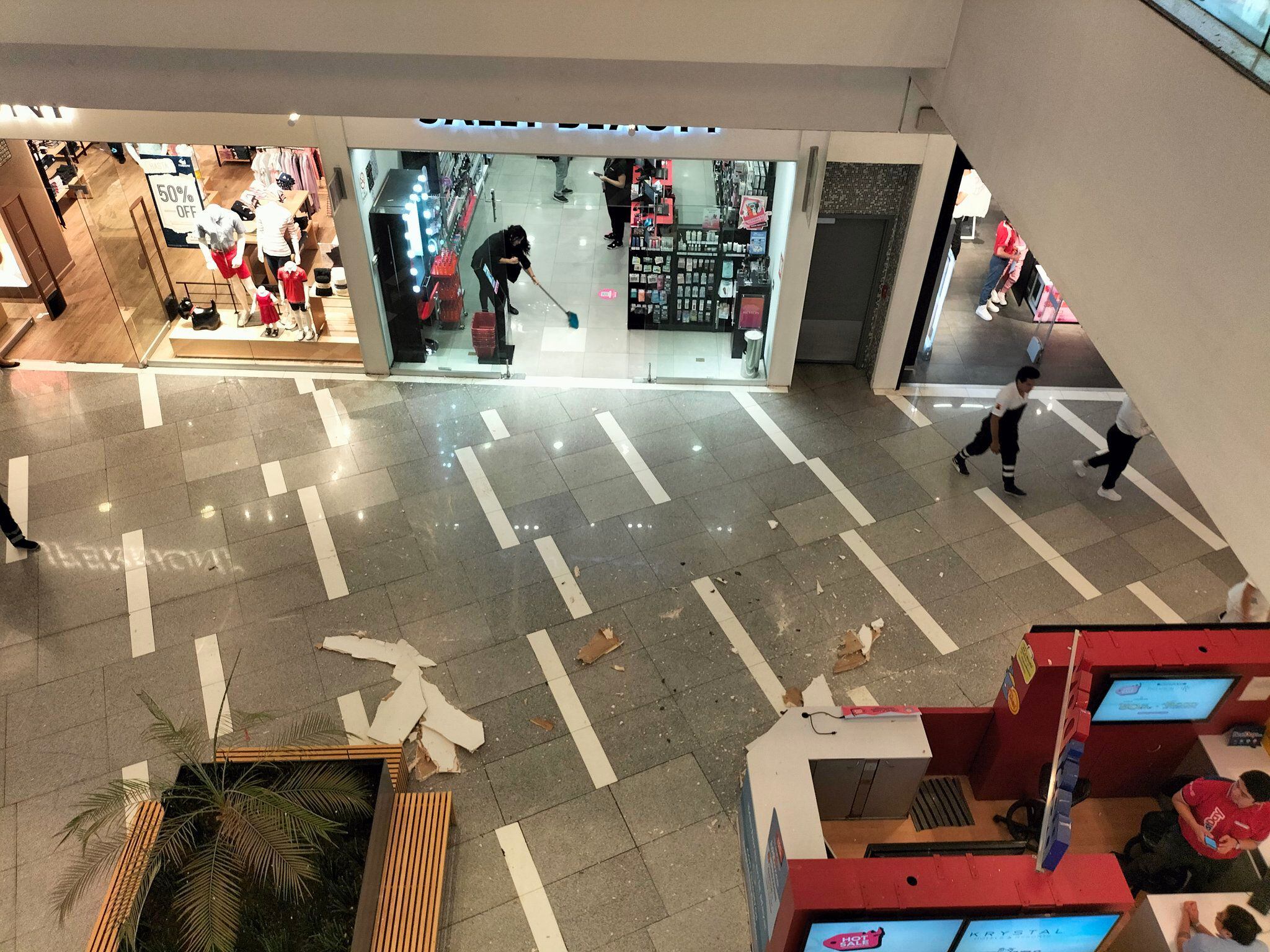 De acuerdo con el internauta @juanynogueira, es posible percibir una aparente vibración en los pisos elevados de esta plaza a la altura de dónde cayó el plafón.