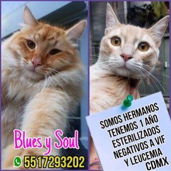 Acerca de los gatos, tienen un año de edad, son de color café amarillento, con ojos color ámbar y algunas líneas en su pelaje. Se llaman Blues y Soul, nombres claramente relacionados con géneros musicales, se encuentran en la Ciudad de México.