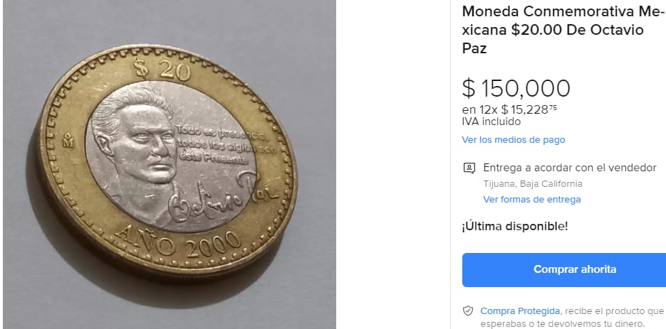 Otra moneda de 20 pesos que se vende en más de 100 pesos es una referente a Octavio Paz. El ejemplar se encuentra ofertado en Mercado Libre y alcanza un precio de hasta 150 mil pesos, la pieza fue emitida en el 2000, diseñada en material de cuproníquel/cuproaluminio, cuenta con una denominación de 20 pesos y conmemora el 20 Aniversario-Entrega del Premio Nobel de Literatura a Octavio Paz.
