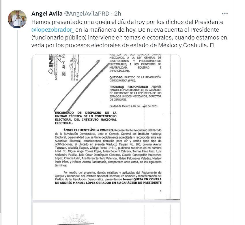 A través de su cuenta de Twitter, Ávila Romero mostró su inconformidad por los dichos del titular del Ejecutivo “no ha entendido que no debe intervenir desde el púlpito presidencial para favorecer a su partido y a sus candidatos”.