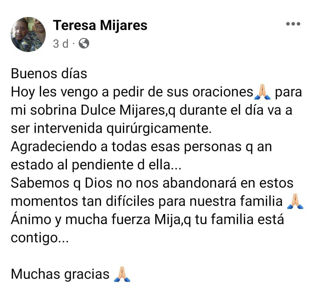 Personas que comparten el apellido de la joven reina de belleza compartieron en redes sociales, donde aseguraron ser parientes de la chica, que se encontraba estable, pero grave y por lo tanto necesitaba ser intervenida quirúrgicamente de emergencia. Por lo que solicitaron apoyo para los gastos médicos que pudieran generarse antes, durante y después de la operación.
