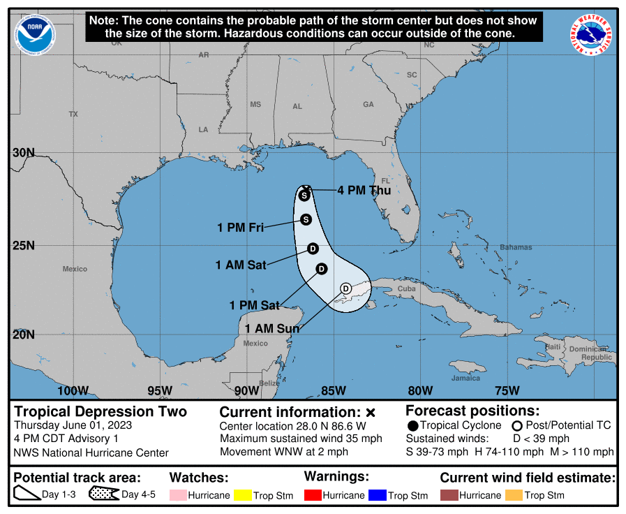 “A las 15:00 horas (del primero de junio), tiempo del centro de México, la Depresión Tropical Dos se formó aproximadamente a 710 kilómetros (km) al norte de Cabo Catoche, Quintana Roo, y a 490 km al oeste-noroeste de Florida, Estados Unidos de América. Tiene desplazamiento hacia el oeste-noroeste a 4 km/h, vientos máximos sostenidos de 55 km/h y rachas de 75 km/h”, detalló la Comisión.