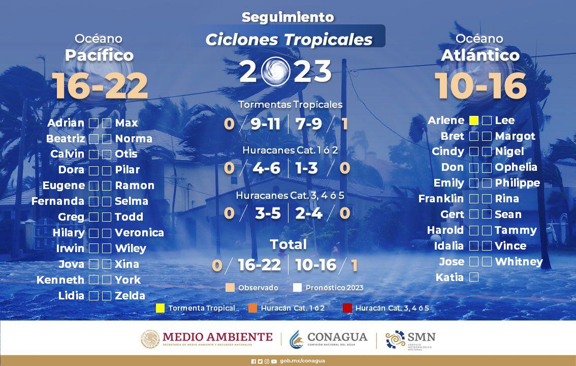 Cabe mencionar que la Tormenta Tropical Arlene se formó un día después del inicio de la temporada de Lluvias y Ciclones 2023 en el Océano Atlántico. El Servicio Meteorológico Nacional (SMN) prevé que pudieran ocurrir entre 10 y 16 ciclones.