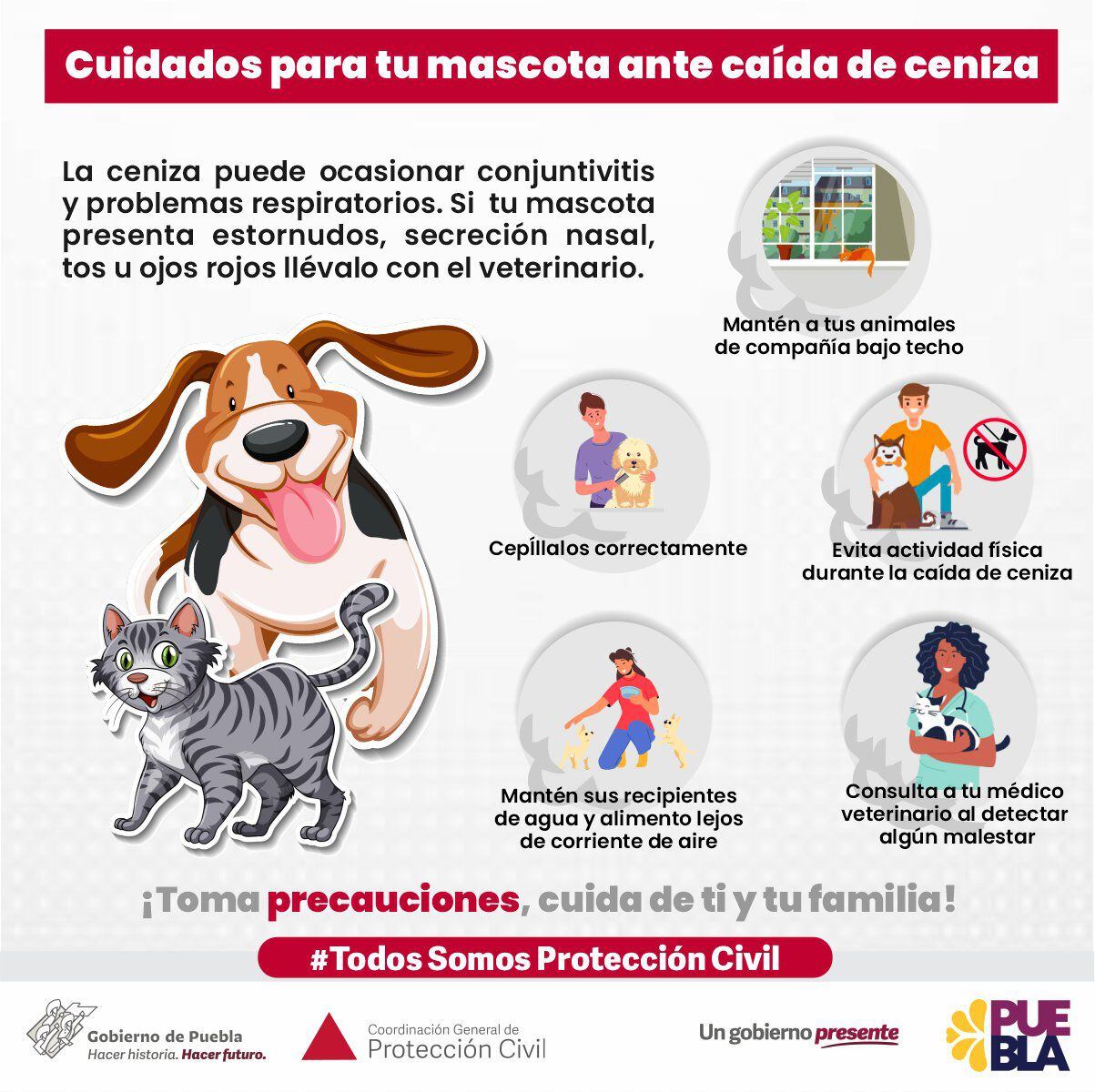 La protección Civil de Puebla recordó los cuidados que se le tienen que brindar a las mascotas en casa ante la caída de ceniza.
