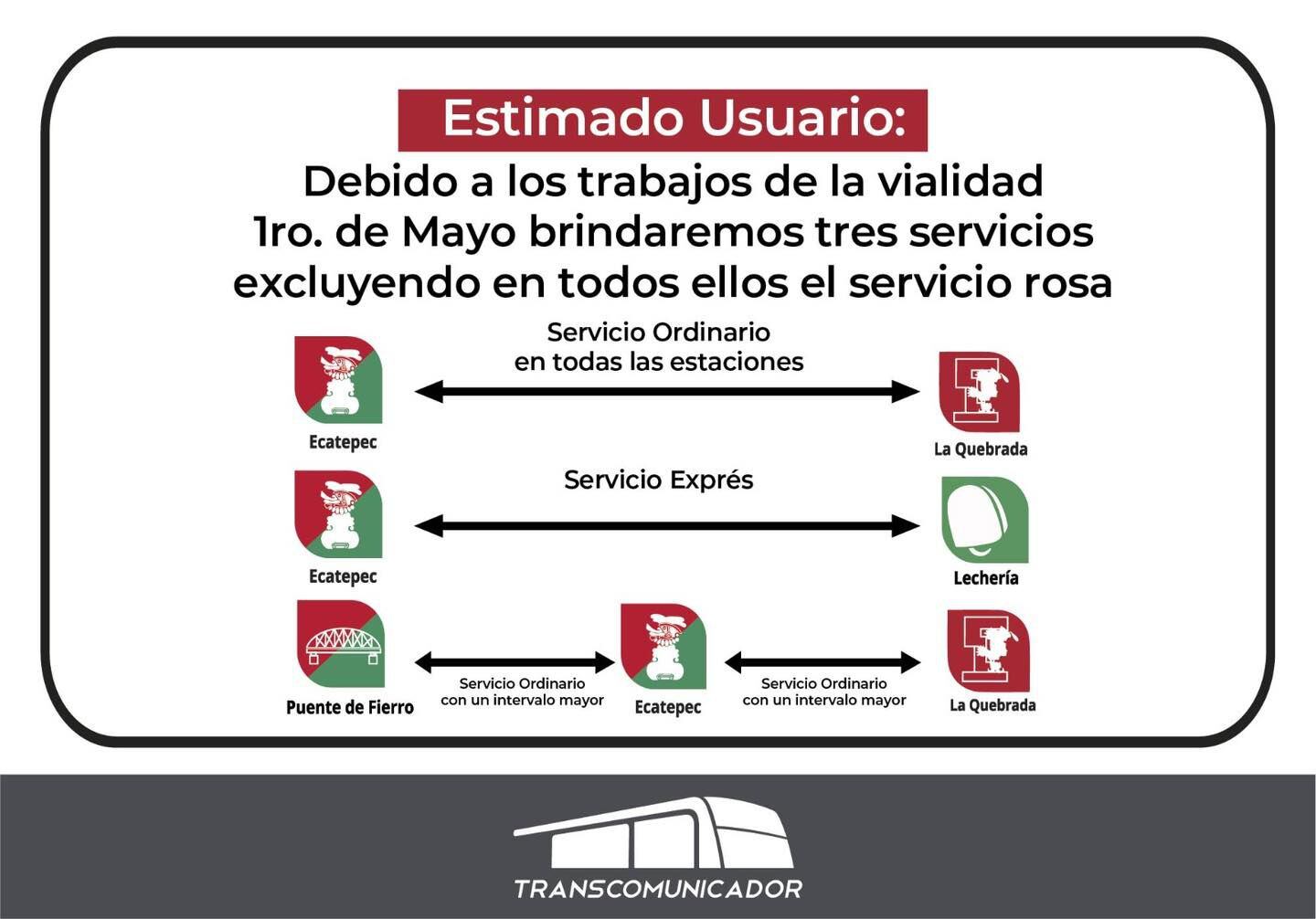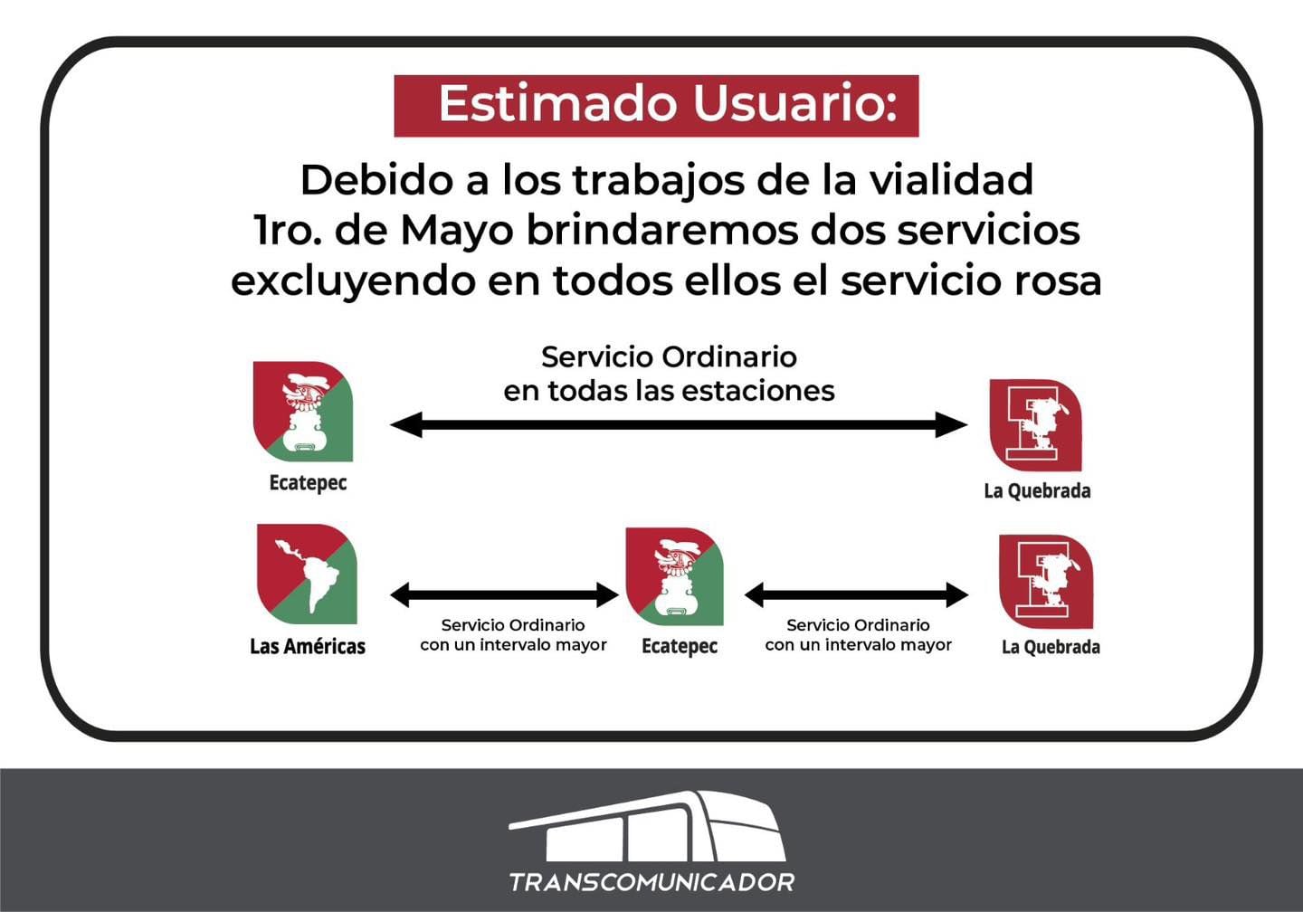 Ante ello, la empresa que opera el Mexibús L2, que corre de la estación las Américas en el municipio de Ecatepec a la zona de la Quebrada y Lechería, en el municipio de Cuautitlán Izcalli, informó que debido al socavón se estaría brindando el servicio de la estación Ecatepec a la Quebrada y el servicio exprés se detuvo para todas las estaciones,