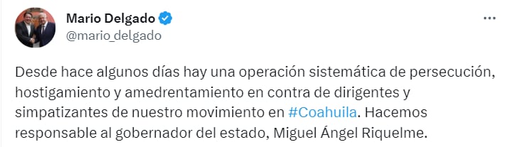 Mario Delgado, presidente nacional de Morena, también envió un mensaje a Riquelme a través de redes sociales. El dirigente morenista acusó que desde días atrás hay “una operación sistemática de persecución, hostigamiento, amedrentamiento” Coahuila, en especial contra dirigentes y simpatizante del partido.