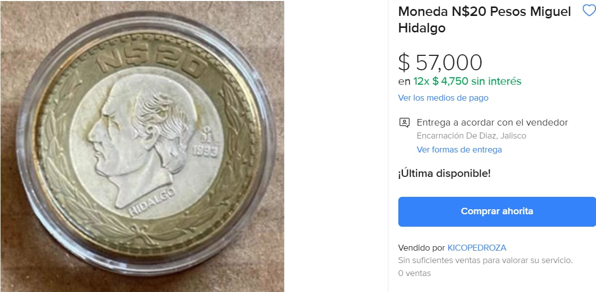 En está ocasión se encontró por medio de una página de compra y venta conocida como Mercado Libre, una moneda de 20 pesos que a la venta supera la cantidad de 50 mil pesos. Se trata de un ejemplar de 20 Nuevos pesos que muestra a Miguel Hidalgo en una de sus caras, su vendedor la oferta en la red en la cantidad de 57 mil pesos.