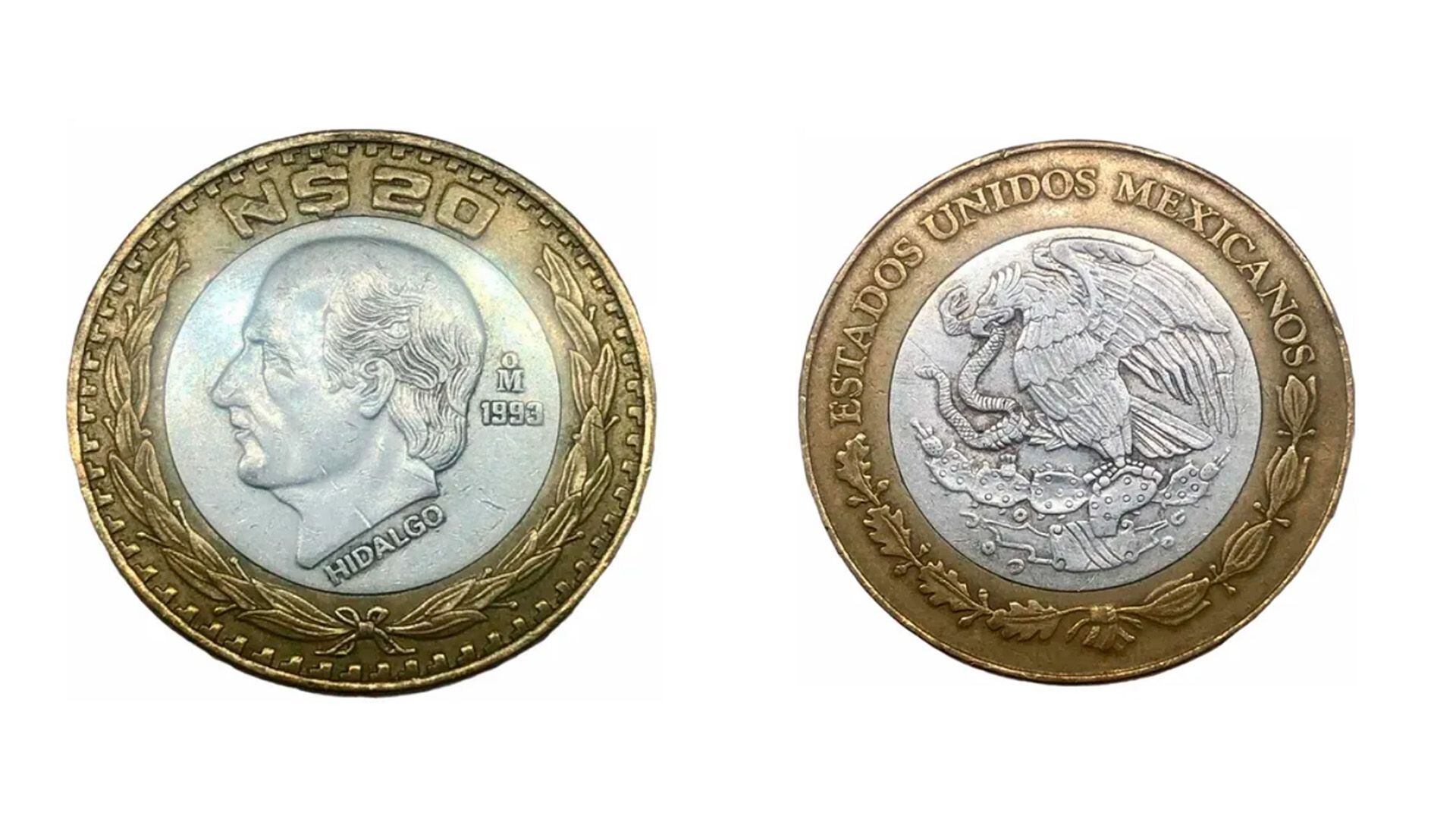 Mientras que en su reverso se puede apreciar la efigie de “Don Miguel Hidalgo y Costilla”, el símbolo de la Casa de Moneda de México “M°”, el año de acuñación, la palabra “HIDALGO”, el símbolo “N$”, el número “20″ y la guirnalda de laureles, junto con un marco liso con gráfila escalonada.