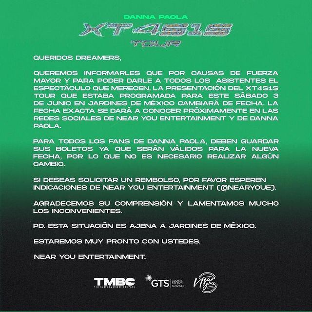 En un comunicado que fue publicado el 2 de junio a través de las redes sociales de Near You Entertainment, organizadores del evento, que el concierto programado para este 3 de junio en Jardines de México será pospuesto.