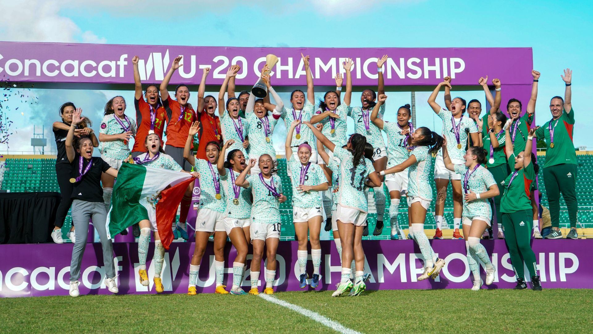 El equipo mexicano ya sube al podio para recibir su premio y medalla de campeonas del Premundial de Concacaf Sub-20 femenil.