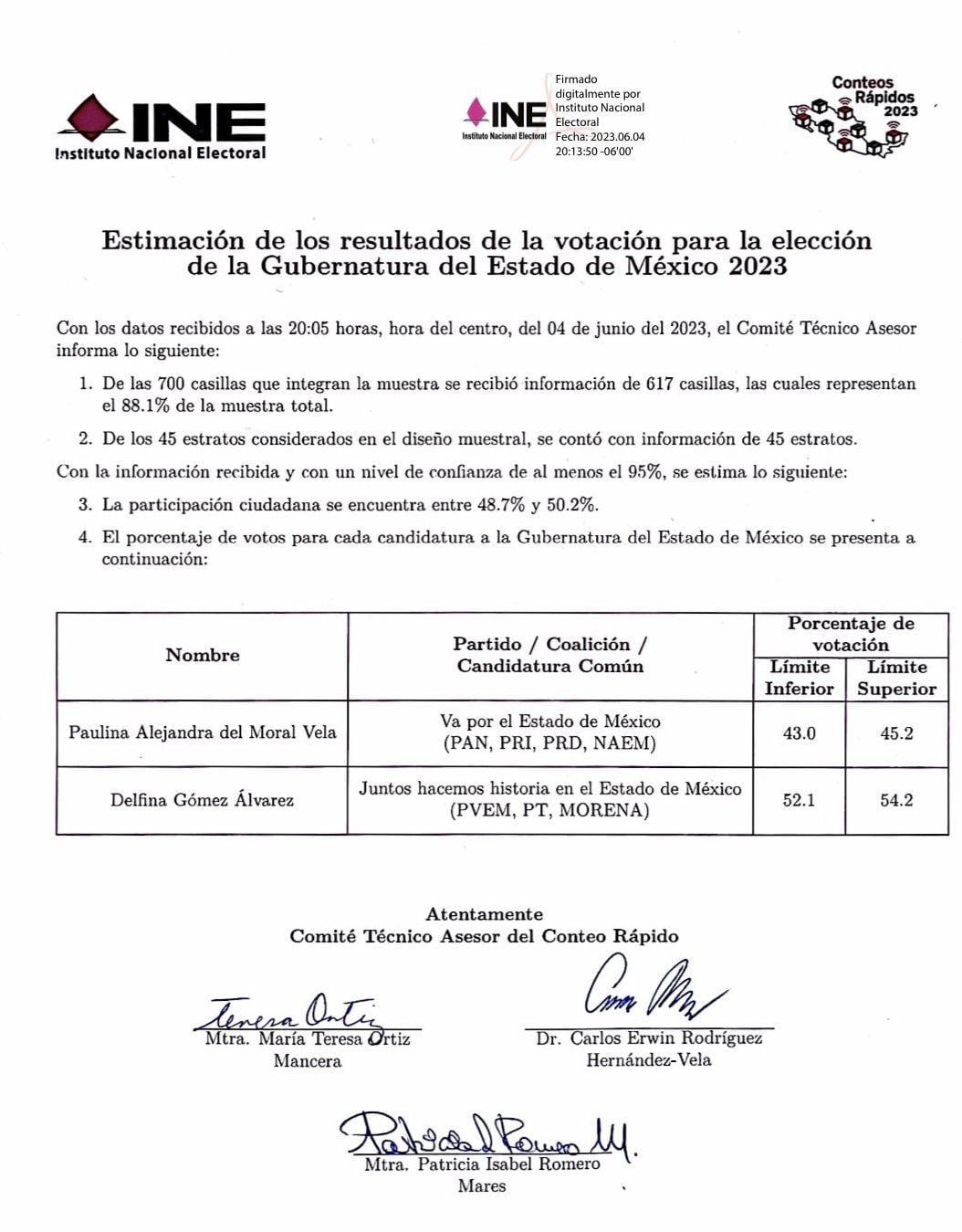 Ahí se dieron las primeras casillas ya contabilizadas en el sistema, en el cual se especificó que de las 700 casillas que componen la muestra, con información registrada de 617 casillas se daría la victoria a Delfina Gómez con un límite entre 52.1 y 54.2, las cuales representan el 88.1% de la muestra.