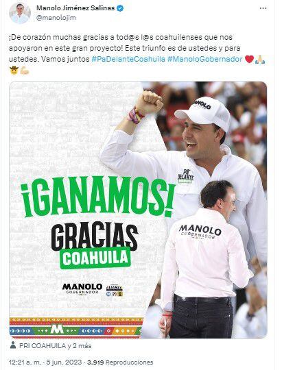 “¡GANAMOS! Con la confianza de los coahuilenses, @manolojim será el próximo gobernador de Coahuila. ¡Así lo decidió la gente y así será por el bien de su tierra, vamos a defender cada uno de los votos!”, dijo.