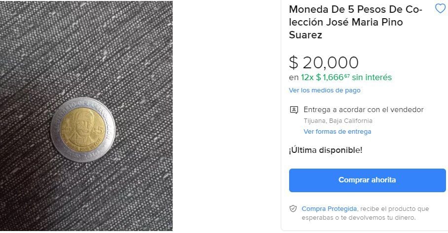 En está ocasión por medio de la página de compra y venta conocida como Mercado Libre, se encontró un ejemplar de 5 pesos que se oferta por más de 15 mil. Se trata una moneda de colección con denominación de 5 pesos, correspondiente al comienzo de la Revolución y que cuenta en una de sus caras con la figura de José María Pino Suárez.