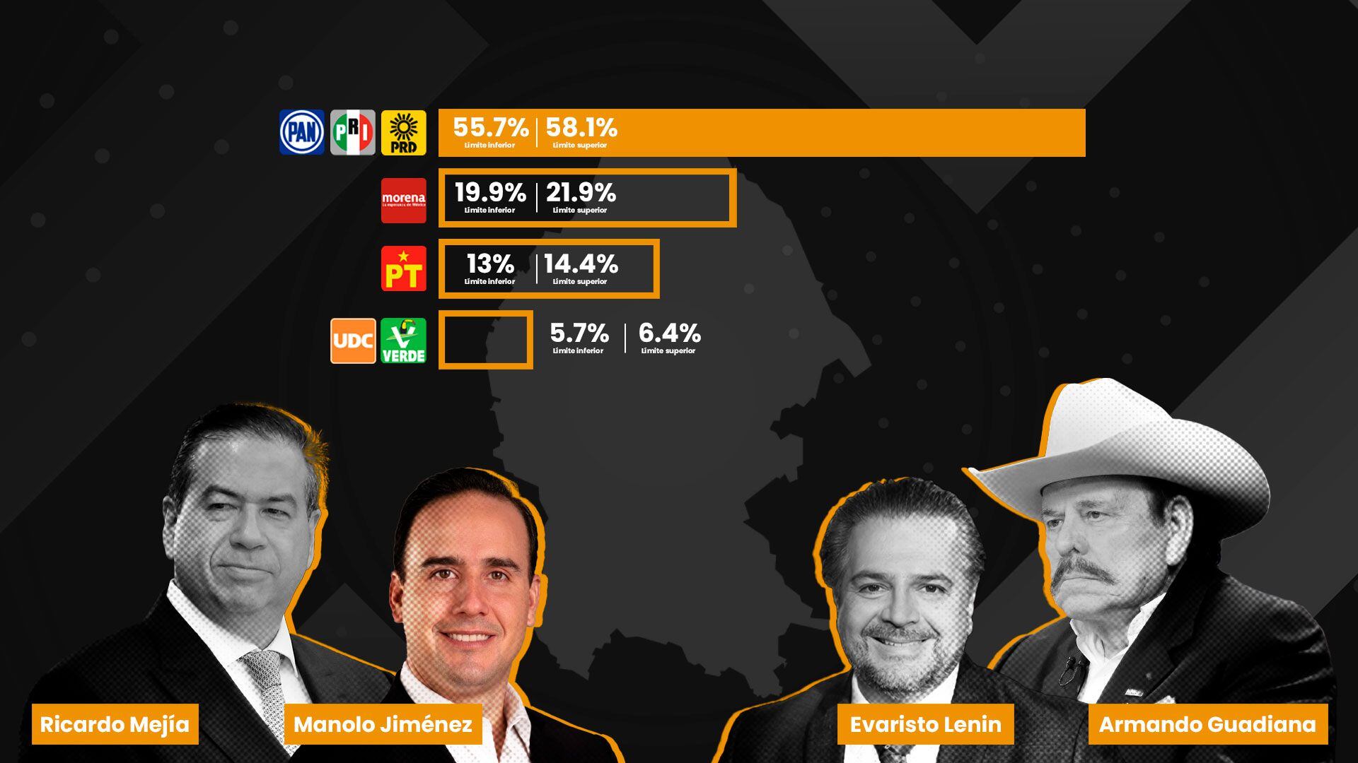 En segundo lugar, se posicionó el abanderado morenista, Armando Guadiana, con un total de 19. 9%, seguido de Ricardo Mejía Berdeja, del Partido de Trabajo (PT), quien alcanzó un 13%.