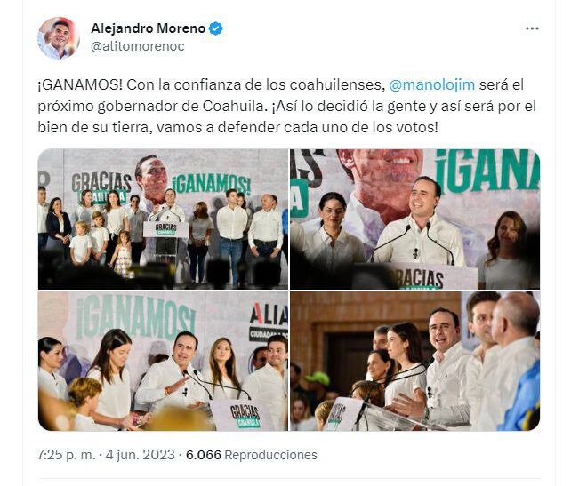 “¡GANAMOS! Con la confianza de los coahuilenses, @manolojim será el próximo gobernador de Coahuila. ¡Así lo decidió la gente y así será por el bien de su tierra, vamos a defender cada uno de los votos!”, publicó.